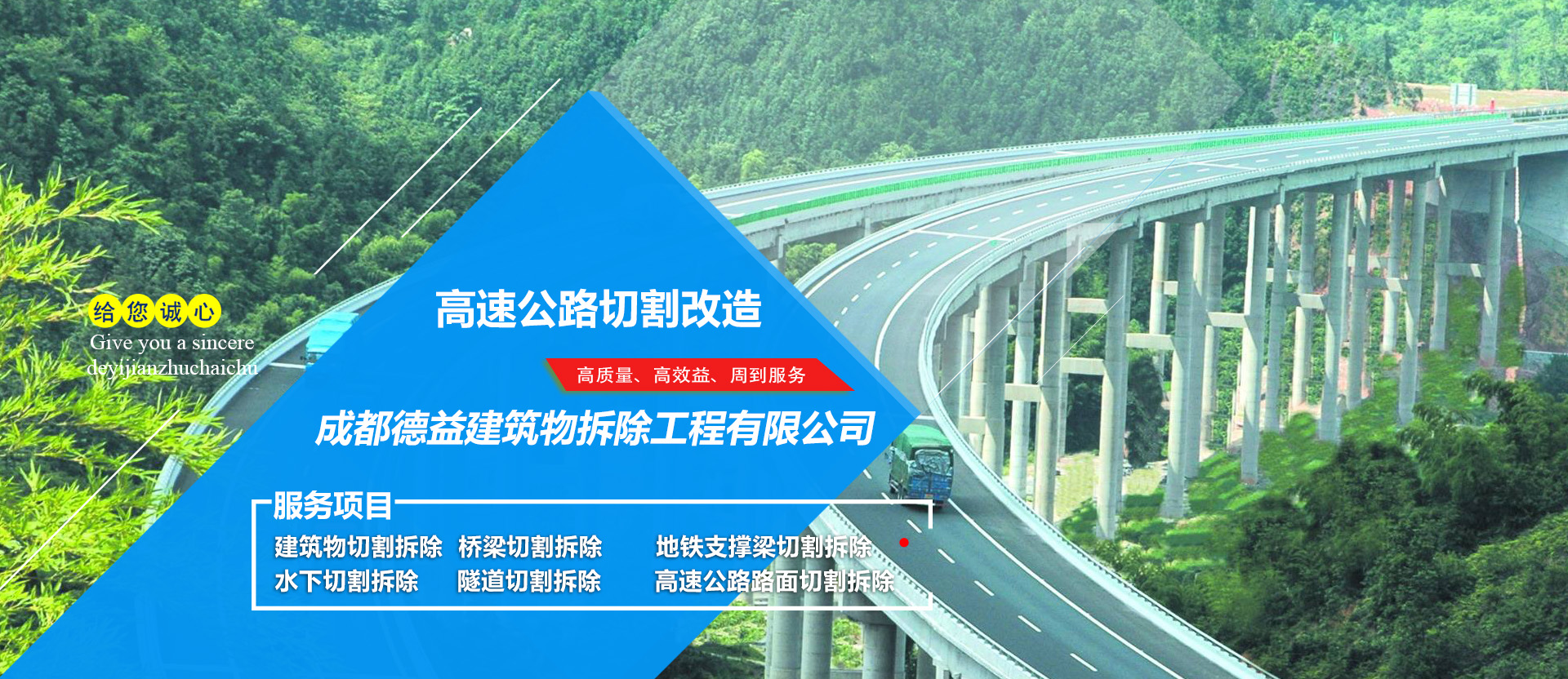 成都德益建筑物拆除工程有限公司是一家專業(yè)混凝土切割拆除,有著多年的混凝土切割拆除施工經(jīng)驗。擁有國內(nèi)外******機械設備。立足成都,面向全國施工,承接大小切割工程,建筑結構加固工程。專業(yè)承接建筑物切割拆除、橋梁切割拆除、地鐵支撐梁切割拆除、水下切割拆除、隧道切割拆除、高速公路路面切割拆除等工程的鋼筋混凝土切割施工,建立以來一直秉持安全高效的宗旨,在專業(yè)混凝土切割拆除施工領域建立了******的口碑。 一直憑借環(huán)保作業(yè),安全施工,收費合理,誠信服務立足于全國建筑物切割拆除施工行業(yè)。我們與中鐵集團、中國路橋....